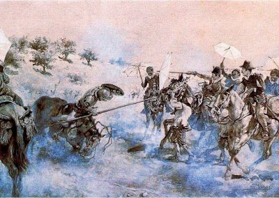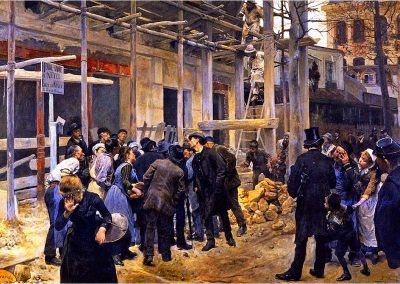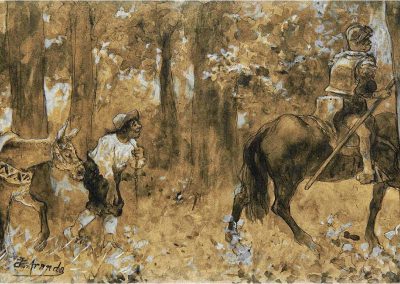 Más tarde, entre 1881 y 1890 José jiménez Aranda, reside en París. Allí se orienta hacia el naturalismo, tanto en las obras de tema contemporáneo y en los paisajes que copia del natural en la Bretaña francesa como en los propios cuadros de «casacones». En 1893, se instala en Sevilla, donde se dedica a pintar temas cervantinos y sociales, así como paisajes. De entre los de temática social destaca Una desgracia, por el que obtuvo primera medalla en la Exposición Nacional de 1890.