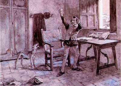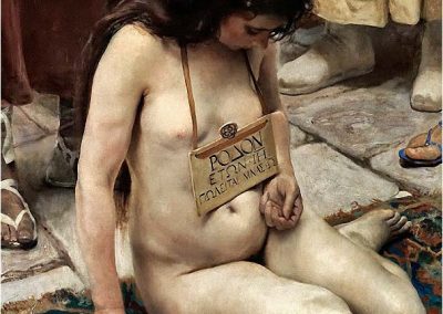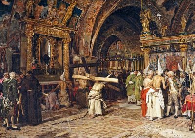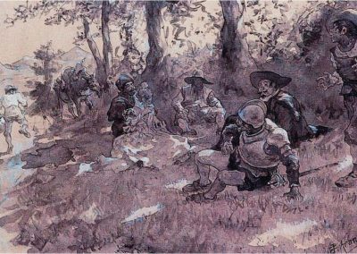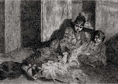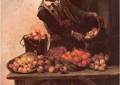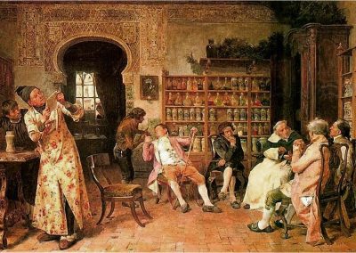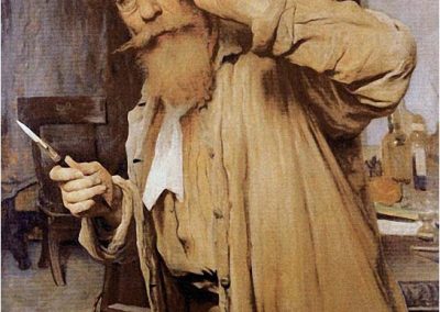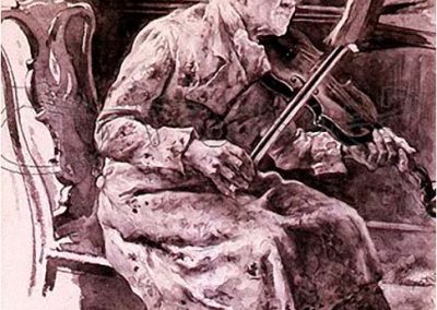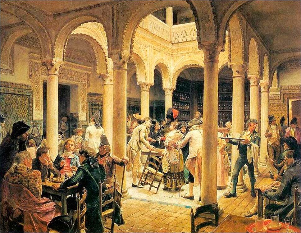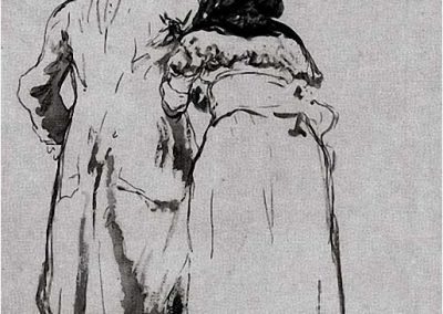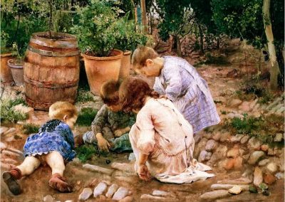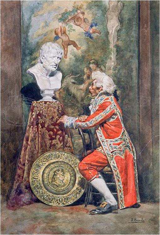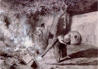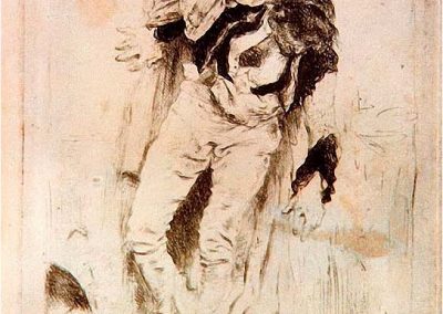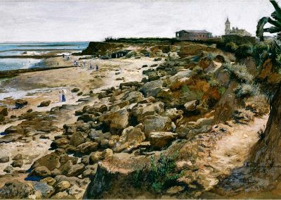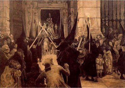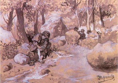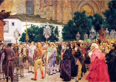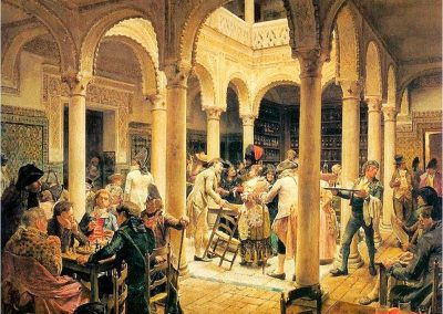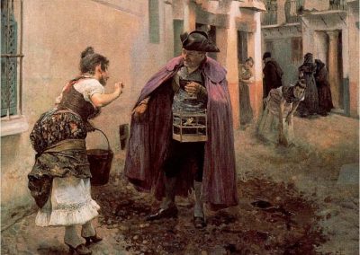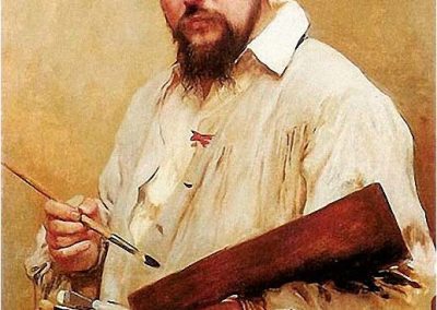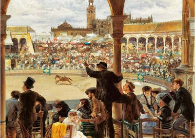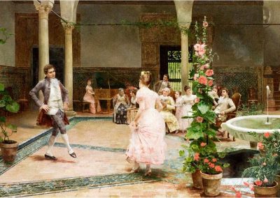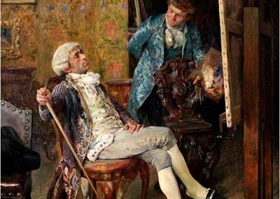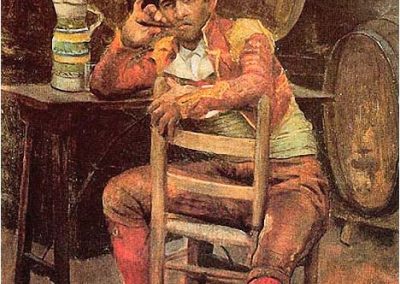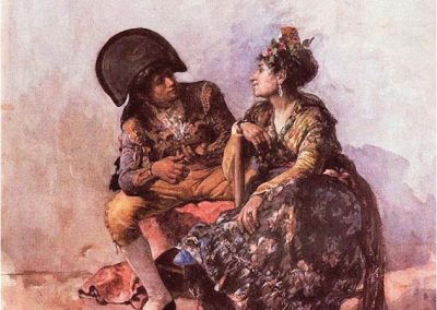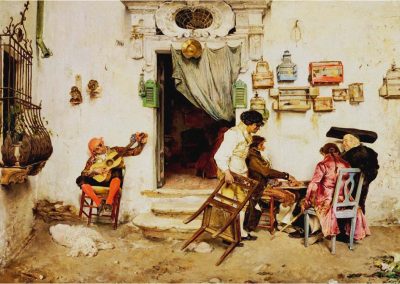 José Jiménez Aranda (1837 – 1903). Pintor español; nació y murió en Sevilla. Inició sus estudios en la Escuela de Bellas Artes de su ciudad natal. Desde sus primeros pasos, se dirige hacia el género costumbrista, así en La huérfana, en el que aparecen ya su interés por lo anecdótico y el dominio del dibujo que caracterizará a toda su obra. Entre 1871 y 1875, amplía estudios en Roma, donde conoce a Fortuny, que influirá en su obra tanto en la ampliación de su gama de colores y en el mayor refinamiento de la composición como en la temática de los «casacones», que con frecuencia sitúa Jiménez Aranda en ambientes andaluces.